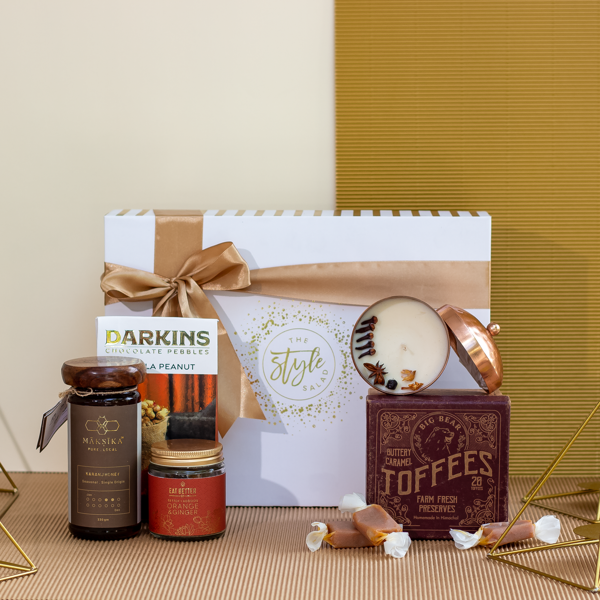 Introducing our exclusive Copper box gift set, a delightful combination of sensory experiences. Initiator Copper Jar Candle is made of copper that casts a warm and inviting glow when lit. Adding a touch of ambiance and warmth to your festive environment. A selection of Caramel Toffees and Orange Ginger Laddoos for sweet indulgence, and the unique Masala Peanut Flavoured Chocolate Pebbles for a spicy chocolate twist. To complement the assortment, we've included Karanj Honey, a light amber nectar with a subtle floral aroma that transports you to a garden stroll. Unveil the essence of Copper box, where taste and fragrance harmonize.
