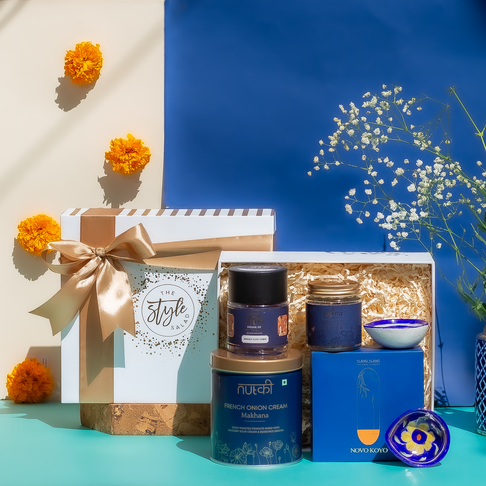 Blue Bijoux, a treasure trove of delight, holds a remarkable array of festive wonders. First, savor the sun-kissed joy with Aam Papad Bites, encapsulating the essence of summer's embrace. Then, ignite the artistic spirit with Blue Pottery Diyas, a duo of culture and craftsmanship, illuminating your celebrations with intricate elegance. French Onion & Cream Makhana offers a sophisticated twist, merging flavors in a symphony of taste. Spiced Cashews take your palate on a bold adventure, an exploration of harmonious spices. Finally, indulge in tranquility with Ylang Ylang Incense Dhoop, an aromatic gateway to serenity.