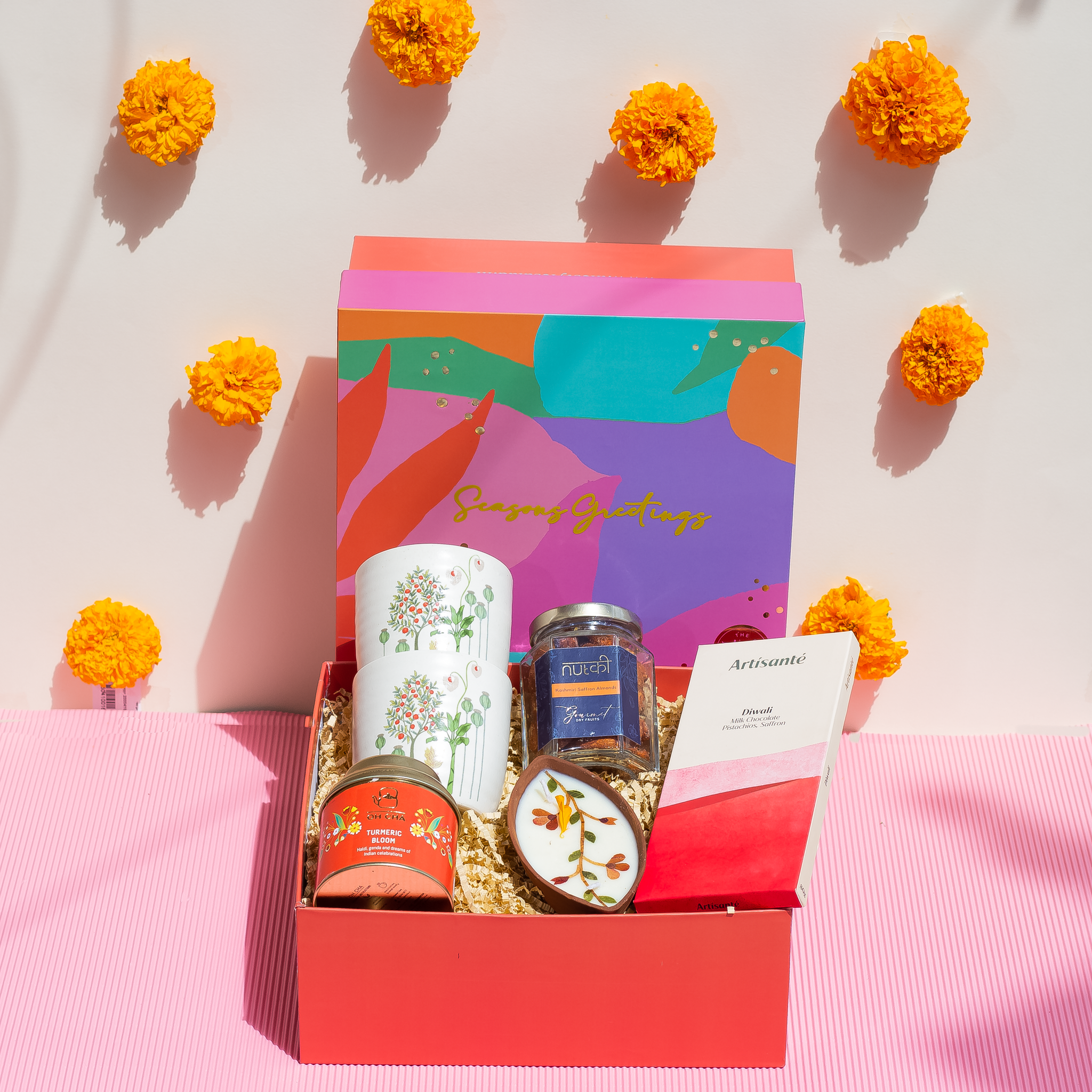 Saffron, the epitome of opulence, brings you a curated collection that transcends the ordinary. In the Bhag Cups, you'll discover not just cups but a duo of elegance, ideal for savoring fine teas or coffees. The Diwali Chocolate Bar isn't just chocolate; it's a celebration in every bite, as it captures the spirit of the festival. Turmeric Bloom Tea is not just tea; it's a blend of wellness and aroma, a golden elixir to rejuvenate your senses. Kashmiri Saffron Almonds aren't just nuts; they are a treasure trove of flavor, a royal indulgence. The Flower Pressed Terracotta Diya isn't just a lamp; it's a symbol of tradition and light, illuminating your celebrations.