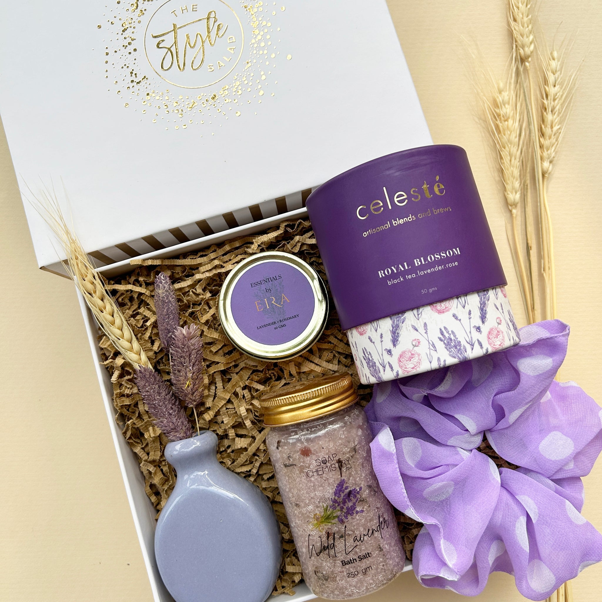 Immerse yourself in Lavender Dreams, a collection featuring grape soda scrunchies, wild lavender bath salts, royal blossom tea, a lavender mini vase, and a captivating rosemary candle. It's the perfect blend of relaxation and luxury, making it an ideal Valentine's day gifts for her.