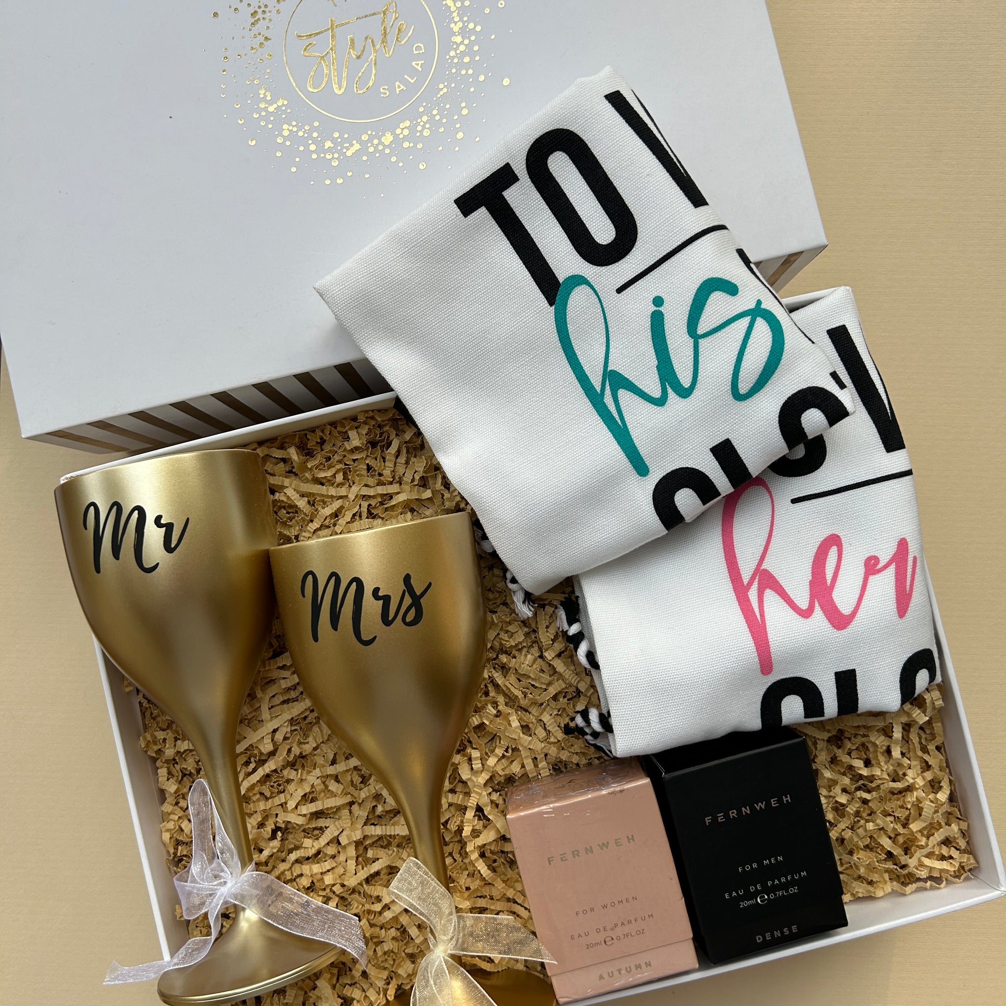 Dive into the eccentric world of Mr. & Mrs. with gold and silver wine glasses, travel shoe bags, and tantalizing perfume sets.